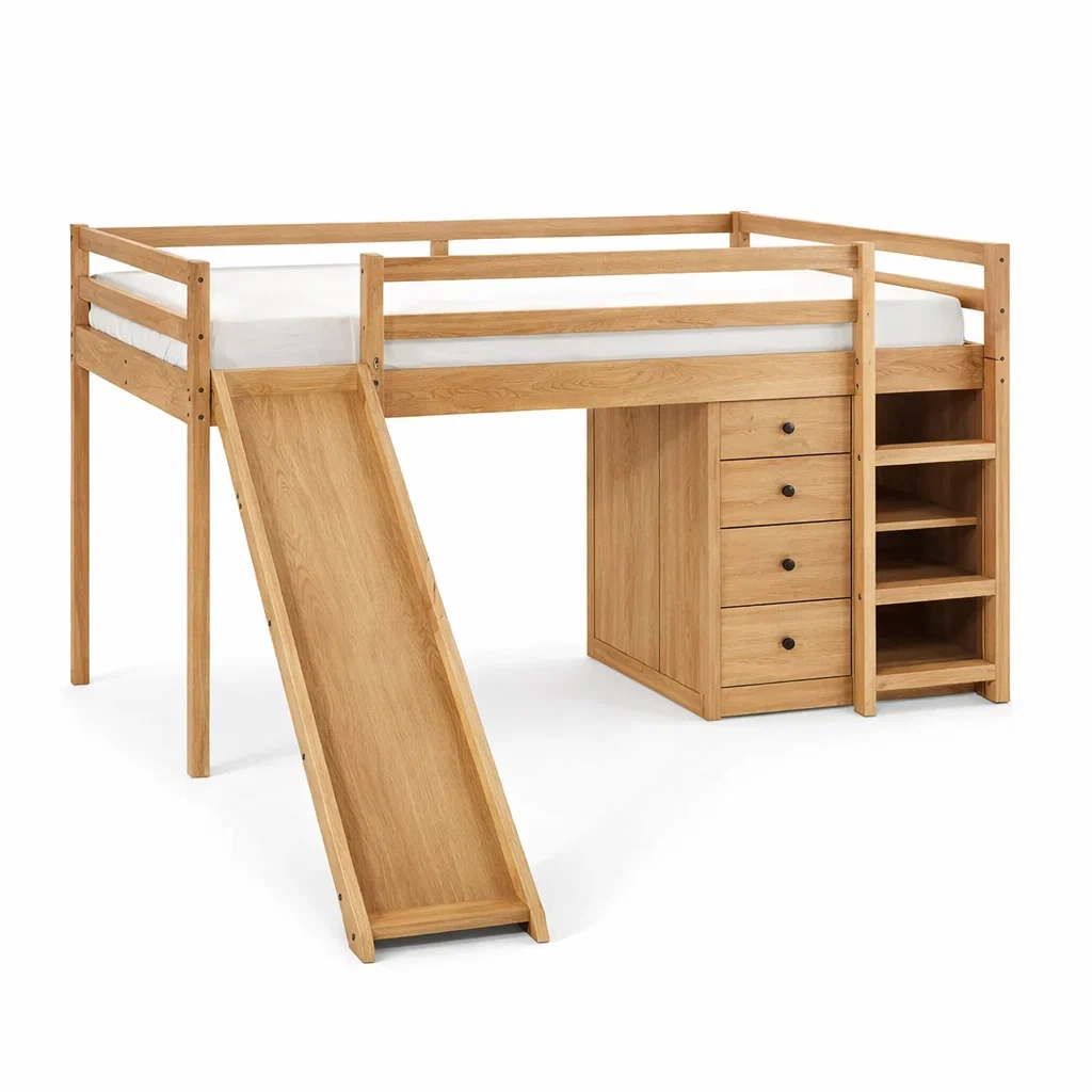 Lit mezzanine en chêne avec toboggan et rangement