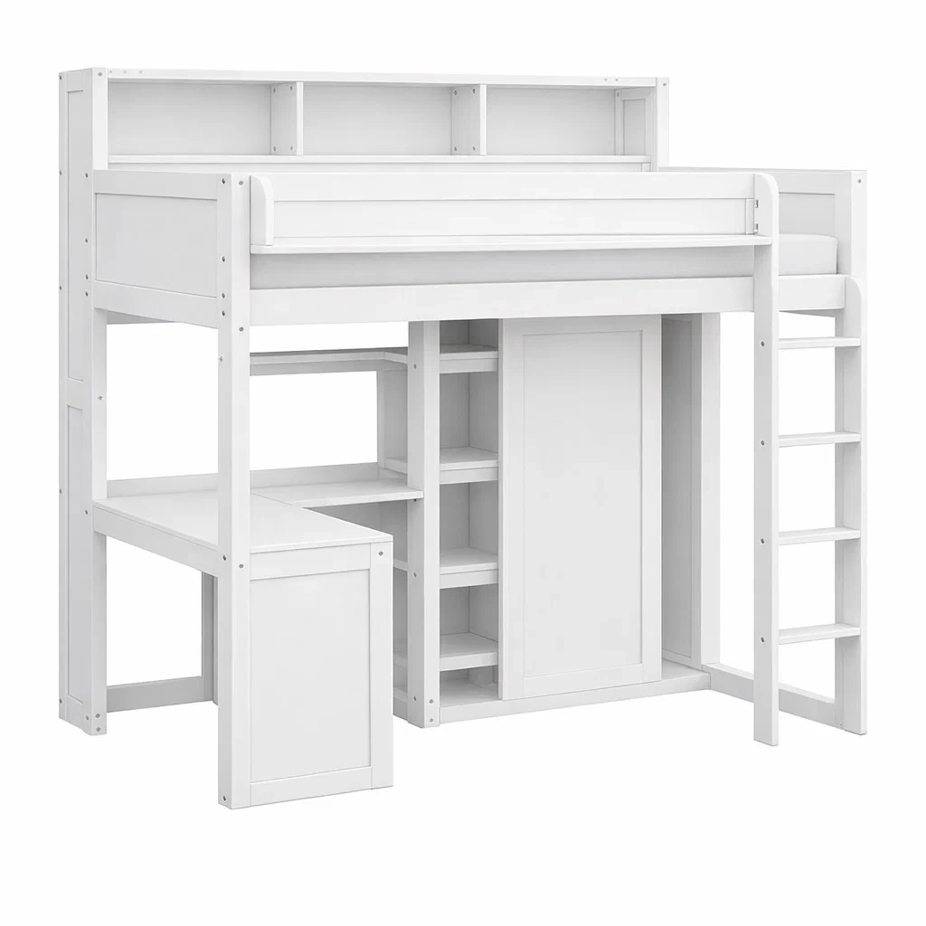Lit mezzanine en bois avec bureau et étagères