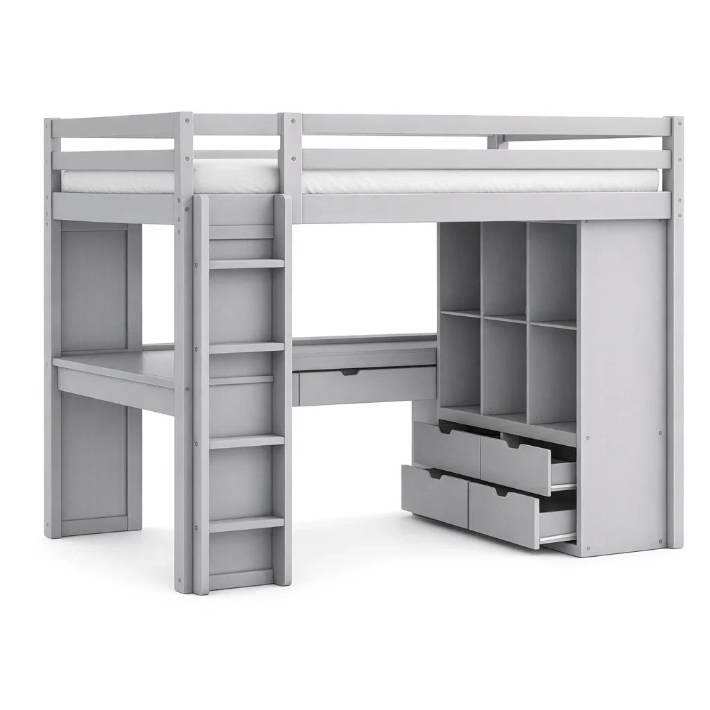 Lit mezzanine en bois gris avec bureau et rangement intégré