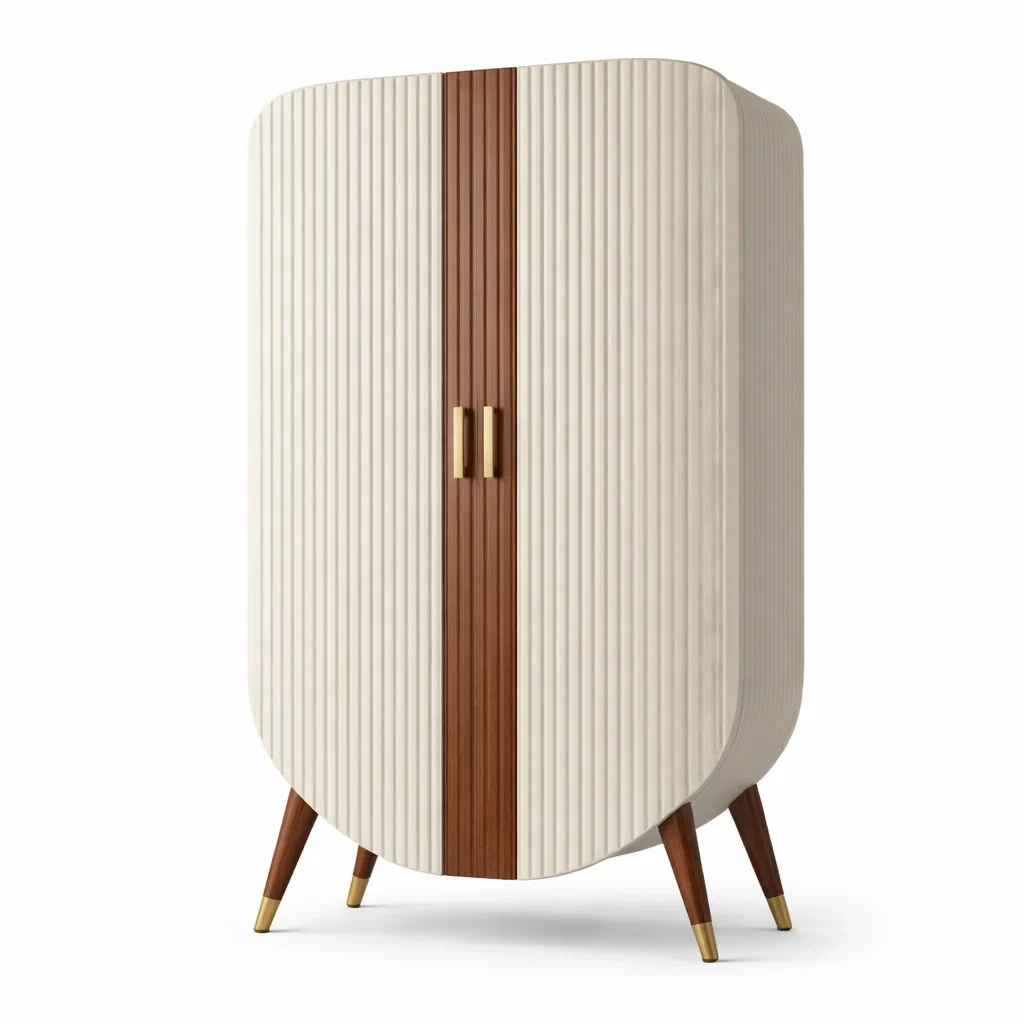 Elle comprend des étagères internes et des portes battantes sans tiroirs, équipées de poignées métalliques. Les pieds en bois inclinés assurent une stabilité robuste.
