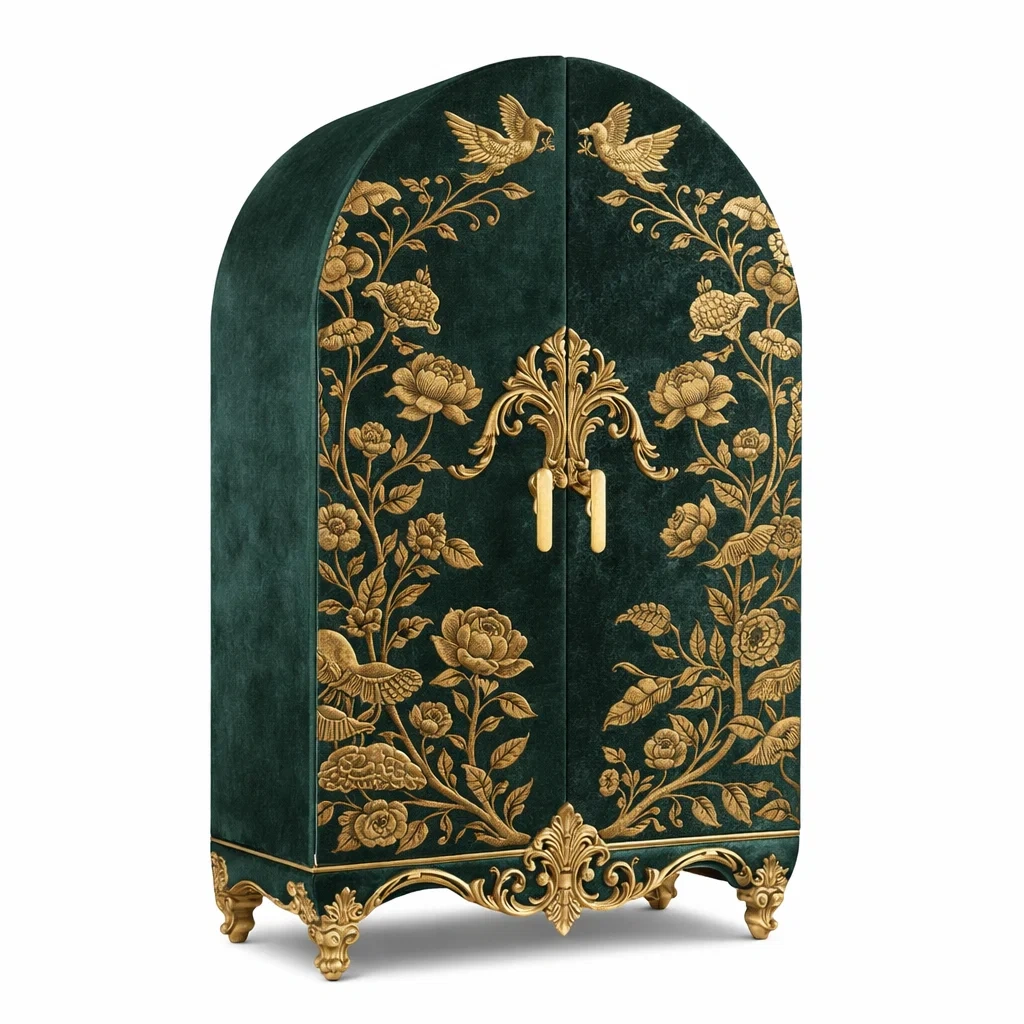 Elle présente des motifs floraux et d'oiseaux dorés sur un fond vert.