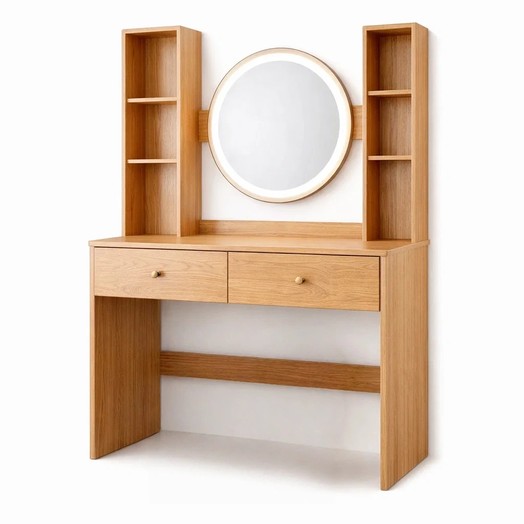 - Composants : 2 tiroirs, miroir rond, 4 étagères