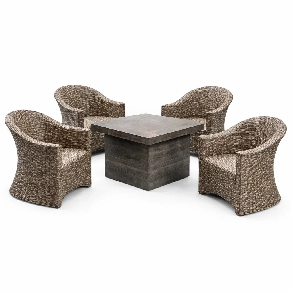 Ensemble de meubles de jardin comprenant une table et quatre fauteuils. Les fauteuils sont fabriqués en résine tressée avec un cadre métallique. La table est en bois composite résistant aux intempéries.