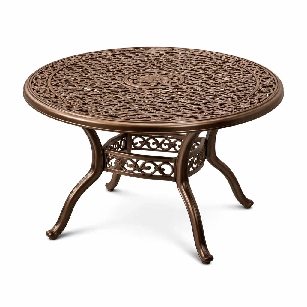Table de jardin en métal avec finition bronze. Diamètre de 120 cm et hauteur de 76 cm, poids de 15 kg. Conception ajourée pour une excellente durabilité.